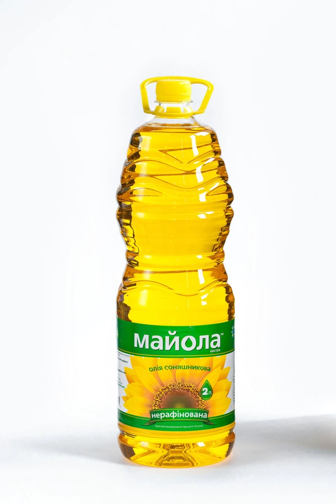 Олія соняшникова нерафінована пресова виморожена першого гатунку Склад: 100% соняшникова олія Об'єм: 2 літра Маса нетто: 1840 г Термін придатності: 9 місяців Енергетична цінність 100 г продукту: 898 кКал Природній вміст вітамінів А, Е, F Виготовляється згідно ДСТУ4492:2005 ISO 22000 Пакується в картонні коробки по 8 пляшок
